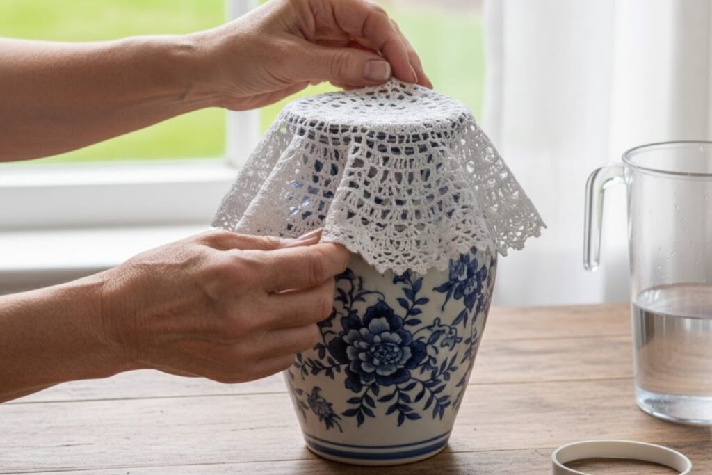 Fill the vase with water. Lay the crochet doily centered directly over the opening, covering the top edge.