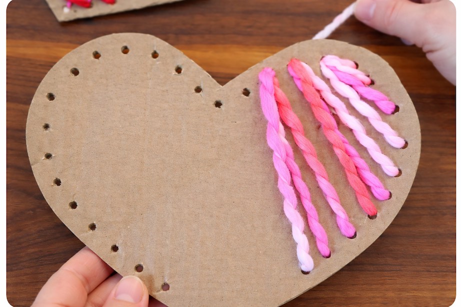 Thread the yarn through the first hole from the back to the front. Now, let your creativity take over! There is no “wrong” way to lace these hearts.