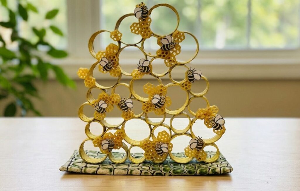 This simple and creative honeycomb craft uses a mix of recycled cardboard tubes and flower-shaped macaroni pasta to create a beautiful piece of art for World Bee Day on May 20th.