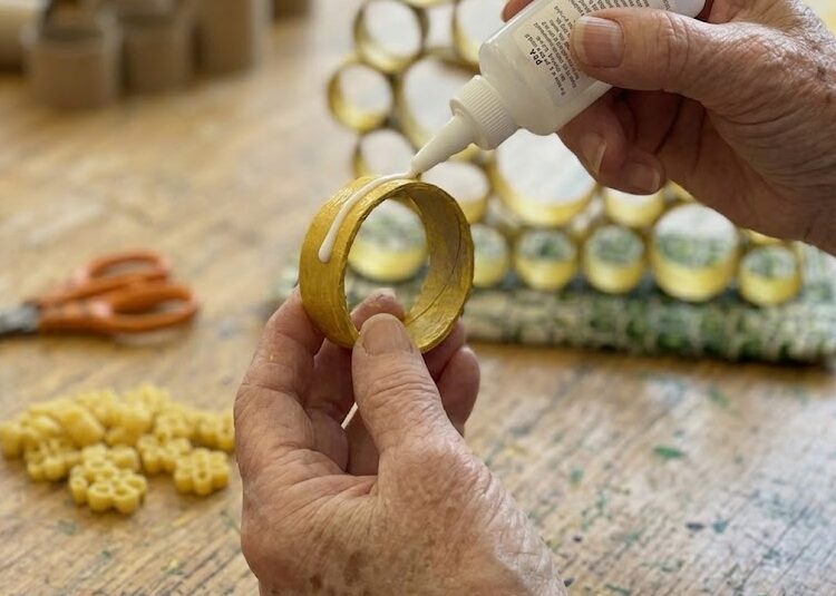 When the main structure is dry, it is time to decorate. Glue the yellow-painted flower macaroni pasta onto the structure — the flower shapes tuck perfectly into the gaps between the cardboard rings, adding a beautiful floral